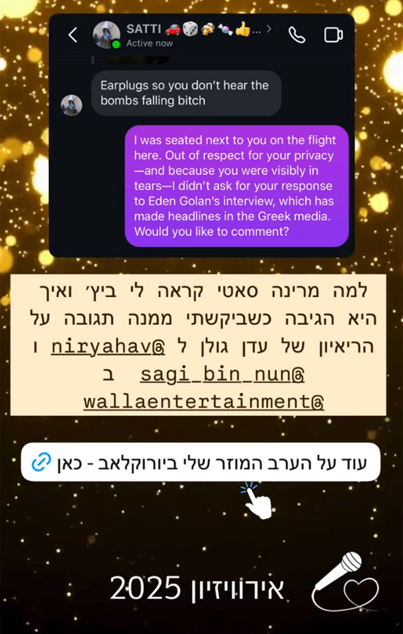 Παράλληλα, σύμφωνα πάντα με τον ίδιο, αρνήθηκε να σχολιάσει οτιδήποτε σχετικό με την περσινή ένταση με την Eden Golan ή τον τρόπο που παρουσιάστηκε στα ελληνικά μέσα ενημέρωσης.