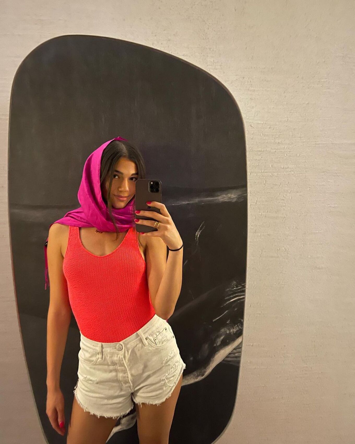 Φορώντας μία μωβ μαντήλα στο κεφάλι πόζαρε χαμογελαστή στον καθρέφτη της και απαθανάτισε τον εαυτό της με την κάμερα.