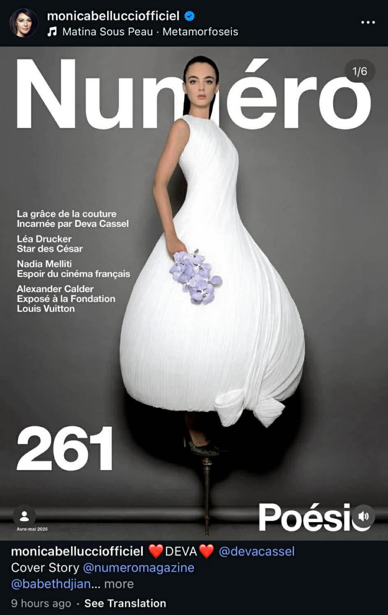 Η 61χρονη ηθοποιός δημοσίευσε στιγμιότυπα από την πρόσφατη επαγγελματική φωτογράφηση της κόρης της, Ντέβα Κασέλ — που έχει αποκτήσει με τον Βενσάν Κασέλ — για το περιοδικό Numero. Για τη μουσική επένδυση της ανάρτησης επέλεξε το τραγούδι «Μεταμορφώσεις», το οποίο είχε ερμηνεύσει ο αείμνηστος Έλληνας καλλιτέχνης.