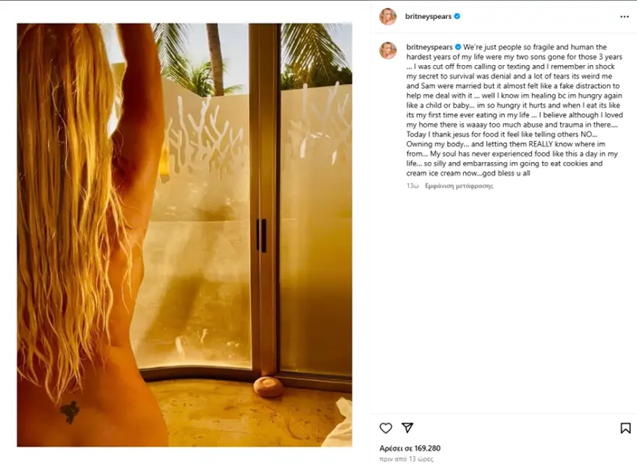 Η 43χρονη ποπ σταρ αναφέρθηκε και στη διαδικασία επούλωσης που βιώνει σήμερα: «Ξέρω ότι επουλώνομαι γιατί νιώθω ξανά πείνα, σαν παιδί ή μωρό… πονάω από την πείνα και όταν τρώω είναι σαν να τρώω για πρώτη φορά στη ζωή μου».