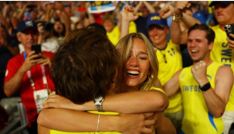 Ο Σουηδός πρωταθλητής Αρμάντ «Μόντο» Ντουπλάντις μπορεί να χρειάστηκε τρεις προσπάθειες για να κατακτήσει το νέο παγκόσμιο ρεκόρ στο άλμα επί κοντώ ανδρών στους Ολυμπιακούς Αγώνες, αλλά η εντυπωσιακή του σύντροφος κατάφερε να κερδίσει τα βλέμματα χωρίς καμία προσπάθεια, καθώς τον αγκάλιαζε για τη νίκη του.