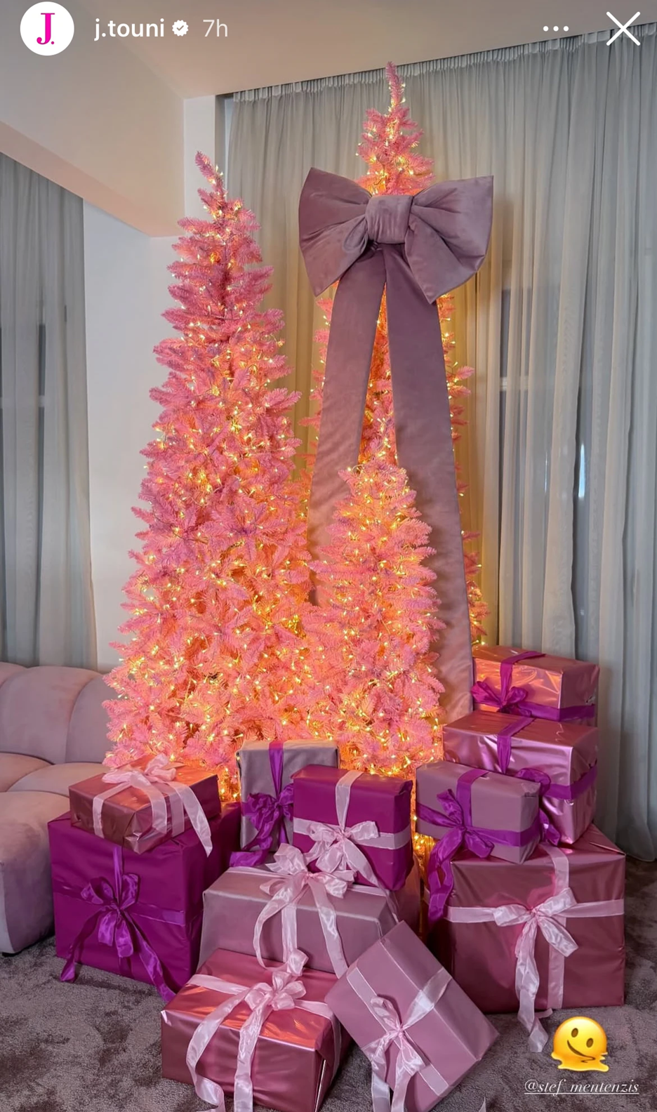 Στη βάση των δέντρων, ροζ κουτιά δώρων ολοκληρώνουν το festive σκηνικό, τονίζοντας ακόμα περισσότερο την αδυναμία της στο συγκεκριμένο χρώμα.