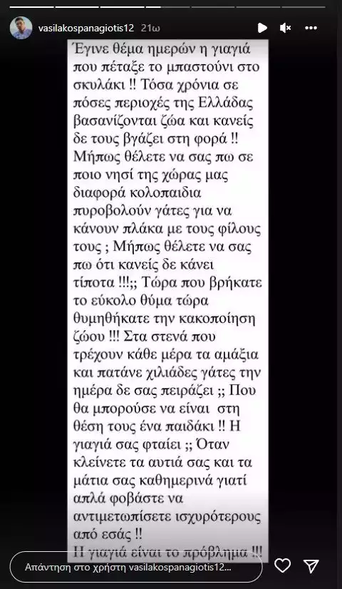 Μήπως θέλετε να σας πω ότι κανείς δε κάνει τίποτα!! Τώρα που βγήκατε το εύκολο θύμα τώρα θυμηθήκατε την κακοποίηση ζώου!! Στα στενά που τρέχουν κάθε μέρα αμάξια και πατάνε χιλιάδες γάτες την ημέρα δε σας πειράζει; Που θα μπορούσε να είναι στη θέση τους ένα παιδάκι! Η γιαγιά σας φταίει; Όταν κλείνετε τα αυτιά σας και τα μάτια σας καθημερινά γιατί απλά φοβάστε να αντιμετωπίσετε ισχυρότερους από εσάς» έγραψε ο Παναγιώτης Βασιλάκος.