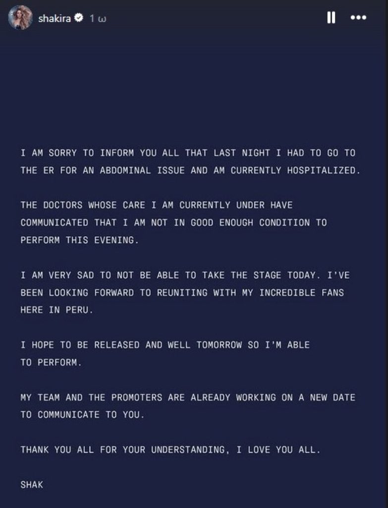 Το Περού είναι ο δεύτερος σταθμός της περιοδείας της στη Λατινική Αμερική, μετά από δύο βραδιές στη Βραζιλία την περασμένη εβδομάδα. Στη δήλωσή της, η Σακίρα είπε ότι ελπίζει να αναρρώσει σύντομα και ζητά συγγνώμη από τους θαυμαστές της που ίσως νιώθουν απογοητευμένοι.