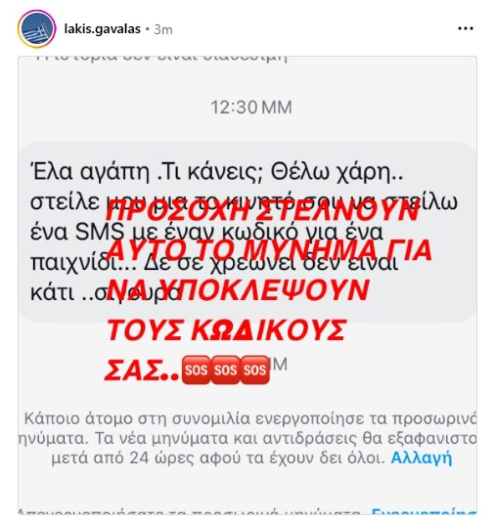 «Πήρα ένα μήνυμα από τον Μιχάλη Ιατρόπουλο που μου έλεγε να πάρω έναν κωδικό για να τον βοηθήσω να κερδίσει σε ένα παιχνίδι, εγώ τον πήρα και αυτός ήταν ο κωδικός για να μπουν μέσα στο Facebook και στο what’s up μου.
