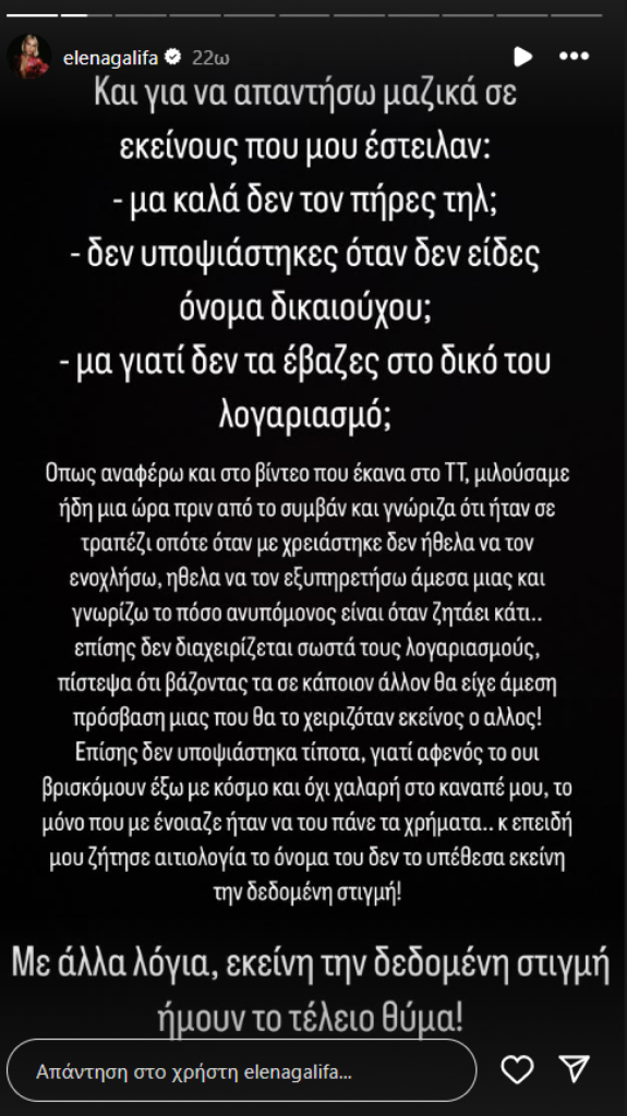 Χαρακτηριστικά έγραψε σε Instagram story: «Και για να απαντήσω μαζικά σε εκείνους που μου έστειλαν: μα καλά δεν τον πήρες τηλέφωνο; Δεν υποψιάστηκες όταν δεν είδες το όνομα δικαιούχου;