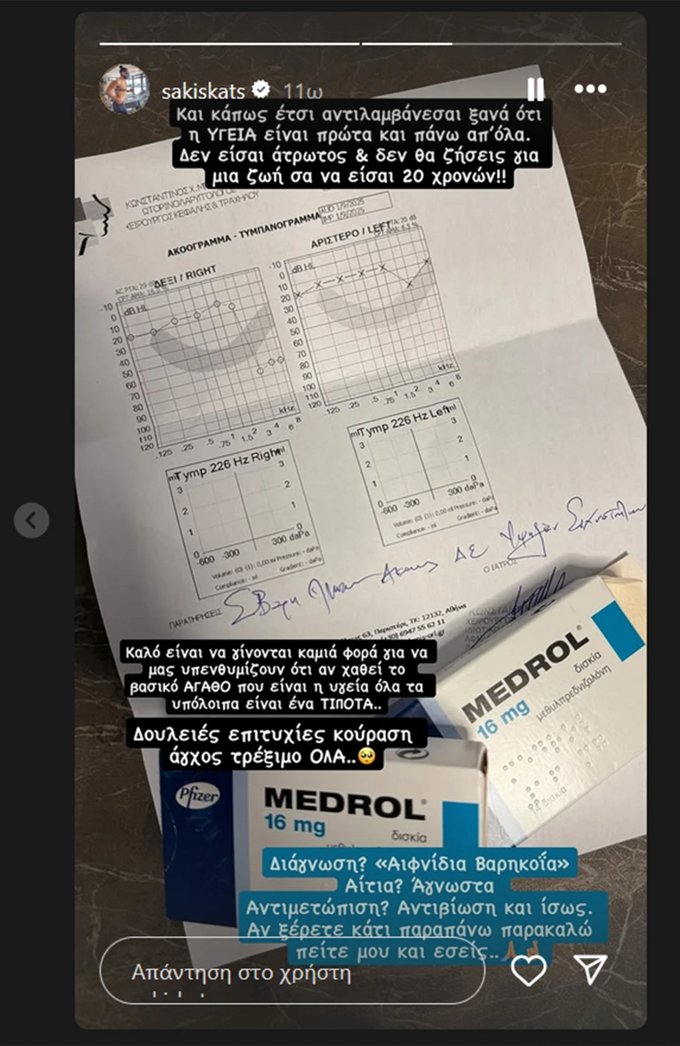 «Και κάπως έτσι αντιλαμβάνεσαι ξανά ότι η υγεία είναι πρώτα και πάνω απ’ όλα. Δεν είσαι άτρωτος και δεν θα ζήσεις για μια ζωή σαν να είναι 20 χρονών. Καλό είναι να γίνονται καμία φορά για να μας υπενθυμίζουν ότι αν χαθεί το βασικό αγαθό που είναι η υγεία, όλα τα υπόλοιπα είναι ένα τίποτα. Δουλειές, επιτυχίες, κούραση, άγχος, τρέξιμο, όλα. Διάγνωση; Αιφνίδια βαρηκοΐα. Αίτια; Άγνωστα. Αντιμετώπιση; Αντιβίωση και ίσως. Αν ξέρετε κάτι παραπάνω παρακαλώ πείτε μου και εσείς», έγραψε ο Σάκης Κατσούλης.