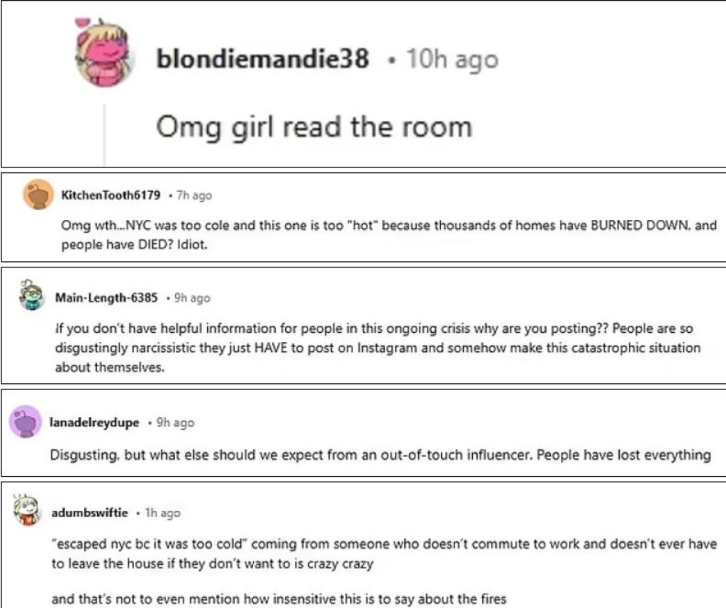 «Θεέ μου, κορίτσι μου δες τι συμβαίνει», «εδώ είναι τόσο “ζεστά” γιατί χιλιάδες σπίτια έχουν καεί και άνθρωποι έχουν πεθάνει… ανόητη», «είναι τρελό να γράφουν τέτοια πράγματα άνθρωποι που δεν εργάζονται και δεν χρειάζεται ποτέ να βγουν από το σπίτι τους», «δεν χρειάζεται να πούμε πόσο αναίσθητη είσαι για τέτοια σχόλια όσον αφορά τις φωτιές» ήταν ορισμένα από τα σχόλια για την ΝτεΆντζελις.