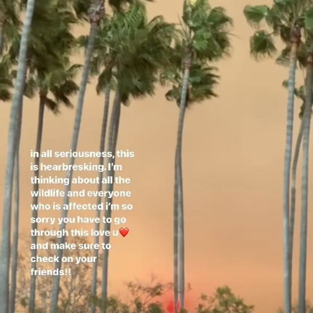 «Με όλη τη σοβαρότητα, αυτό μου σπαράσει την καρδιά. Η σκέψη μου σε όλους που έχουν επηρεαστεί. Είμαι τόσο λυπημένη για ό,τι περνάτε» έγραψε σε μια φωτογραφία από τις καμένες περιοχές.