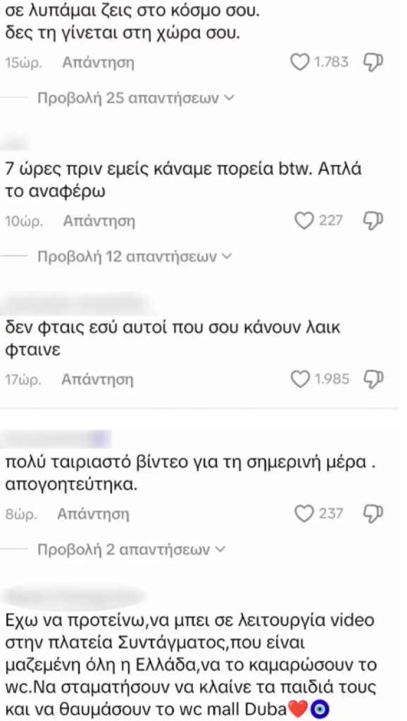 «7 ώρες πριν, εμείς κάναμε πορεία», γράφει κάποιος, ενώ ένας άλλος πρόσθεσε: «Σε λυπάμαι, ζεις στον κόσμο σου. Δες τι γίνεται στη χώρα σου». Σε άλλο σχόλιο, εντοπίζουμε να γράφεται: «Πολύ ταιριαστό βίντεο για τη σημερινή ημέρα, απογοητεύτηκα».