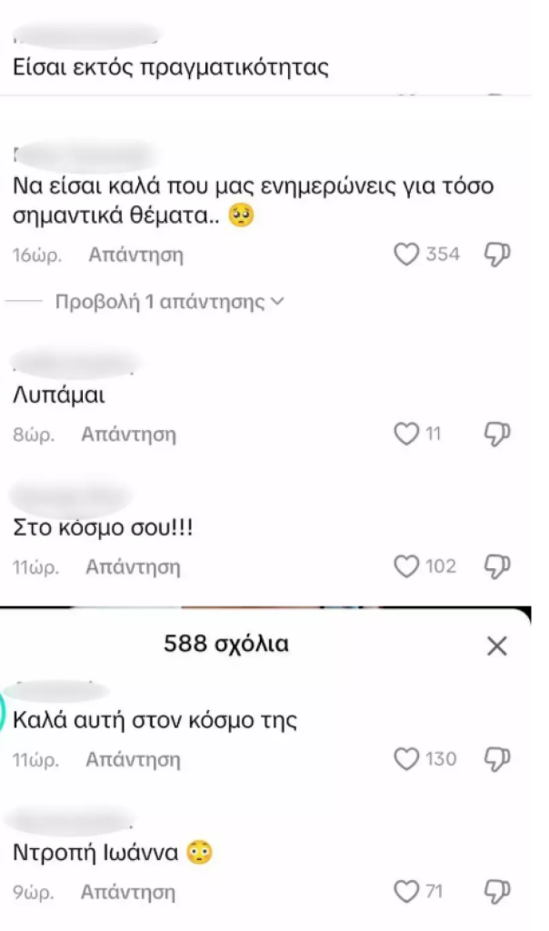 Ιδιαίτερα στα βίντεο που ανέβασε στο TikTok, οι διαδικτυακοί της φίλοι δεν δίστασαν να τη σχολιάσουν αυστηρά, επικρίνοντάς τη για όσα ανεβάζει αυτές τις ημέρες.