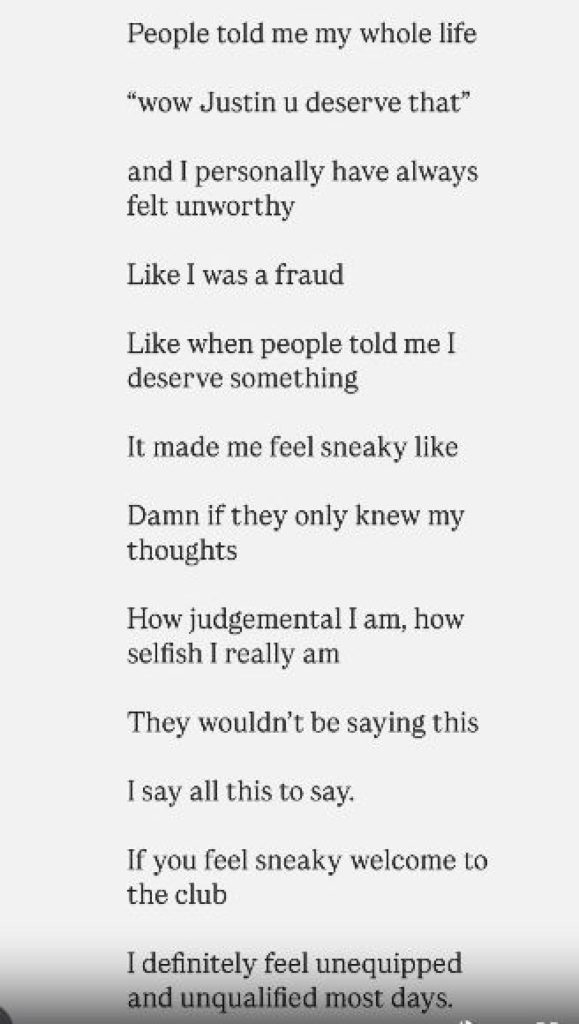 «Οι άνθρωποι σε όλη μου τη ζωή “ουάου Τζάστιν αυτό σου άξιζε”. Κι εγώ προσωπικά νιώθω ανάξιος, σαν να ήμουν μια απάτη όταν οι άνθρωποι μου λένε ότι αξίζω κάτι.