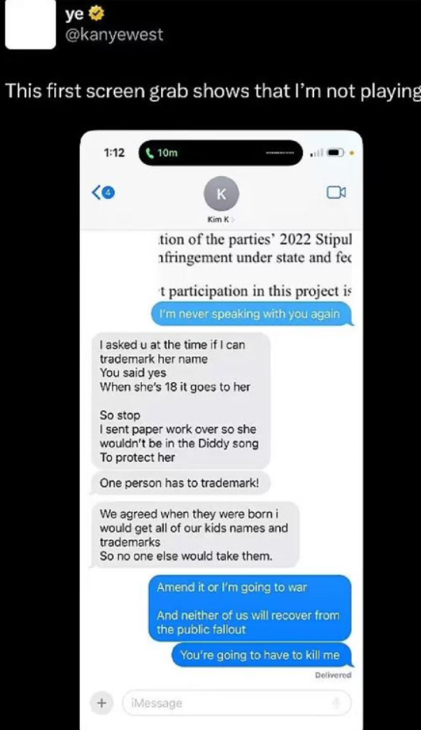 «Σε ρώτησα τότε αν μπορώ να κατοχυρώσω το όνομά της. Είπες ναι. Όταν γίνει 18, θα της ανήκει. Σταμάτα λοιπόν», φέρεται να του απάντησε η πρώην σύζυγός του, σύμφωνα με στιγμιότυπα συνομιλίας που δημοσίευσε ο Κάνιε Γουέστ και στη συνέχεια τα διέγραψε.