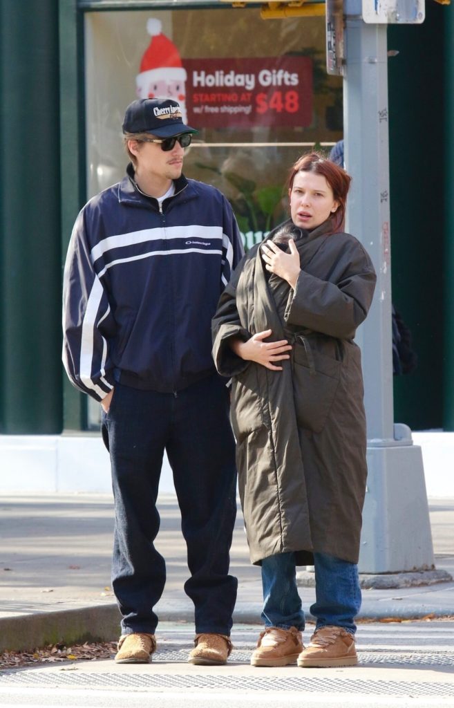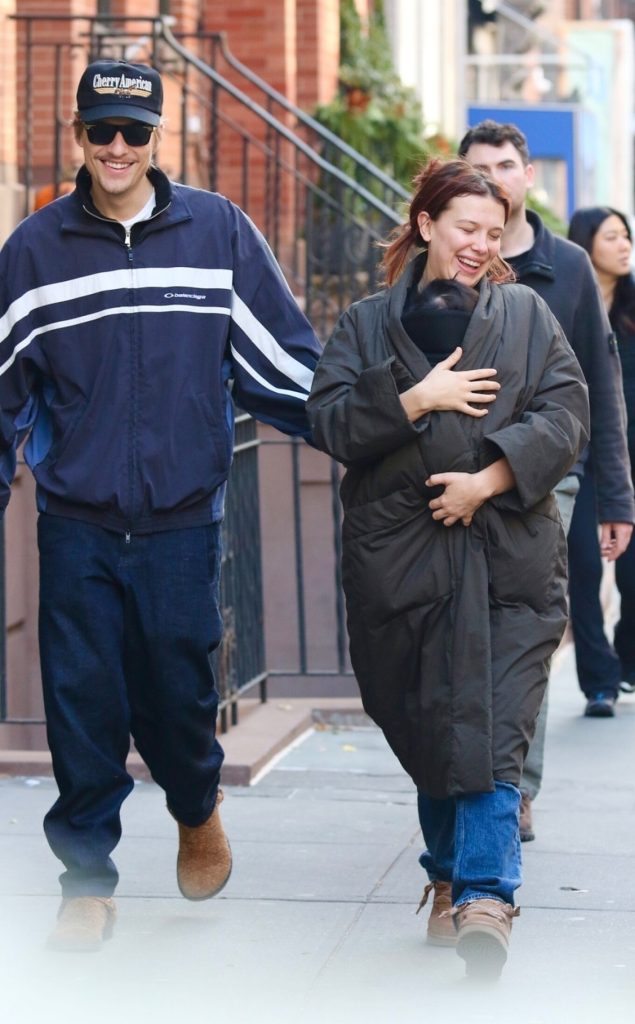 Η Μίλι Μπόμπι Μπράουν φορούσε ένα μακρύ μπουφάν και ο σύζυγός της εθεάθη με τζάκετ και τζιν.