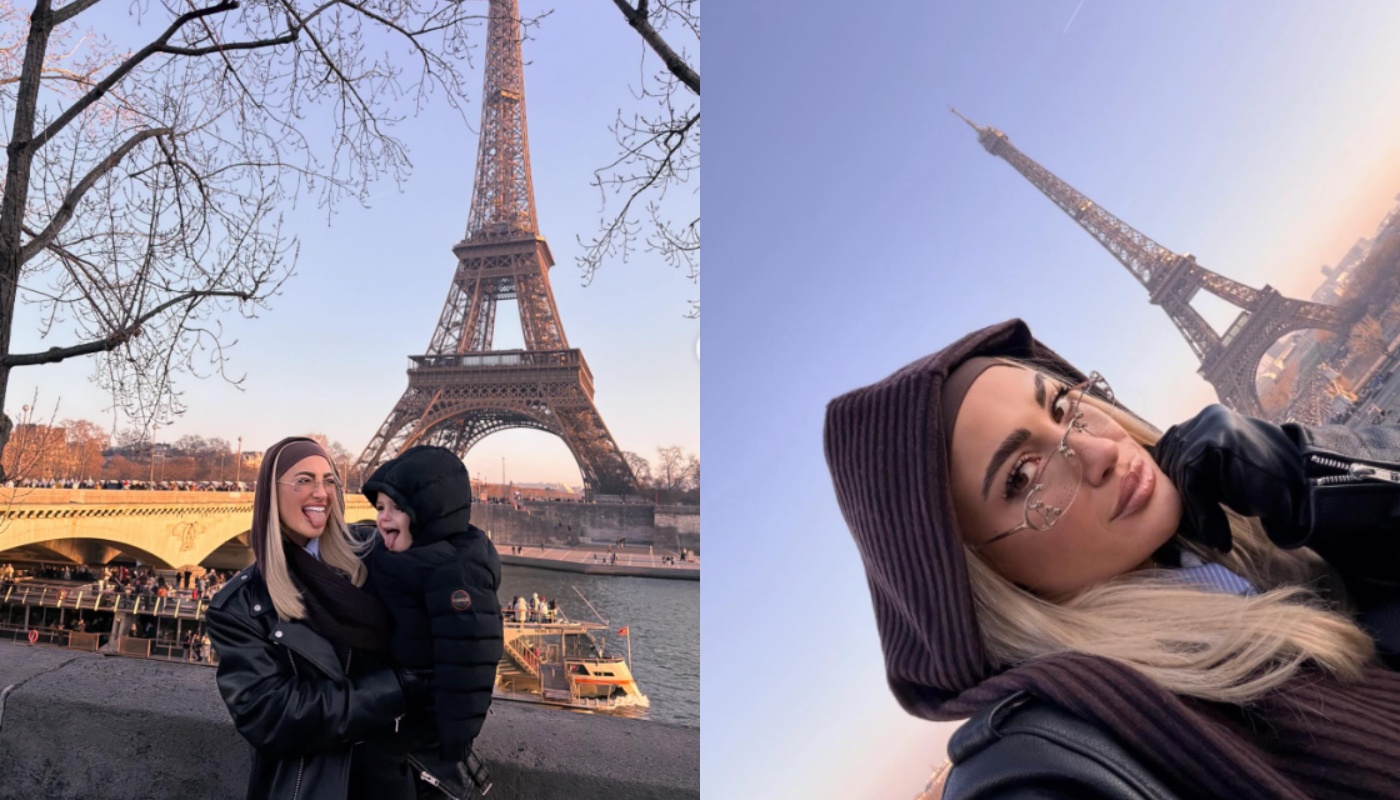 Στα στιγμιότυπα, είτε μόνη της είτε έχοντας στην αγκαλιά της το παιδί της, η Ιωάννα Τούνη ποζάρει με τον Πύργο του Άιφελ να διακρίνεται στο βάθος.