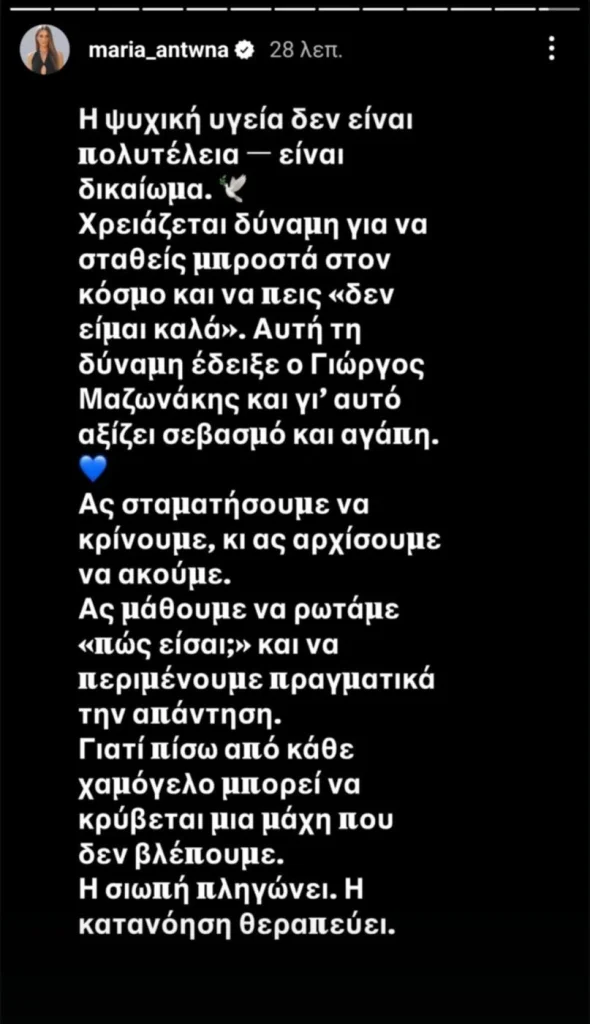 Με ανάρτηση ως story στο instagram, η Μαρία Αντωνά υπερασπίστηκε τον Γιώργο Μαζωνάκη, ο οποίος εισήχθη χθες (14/08) σε δημόσια ψυχιατρική κλινική.