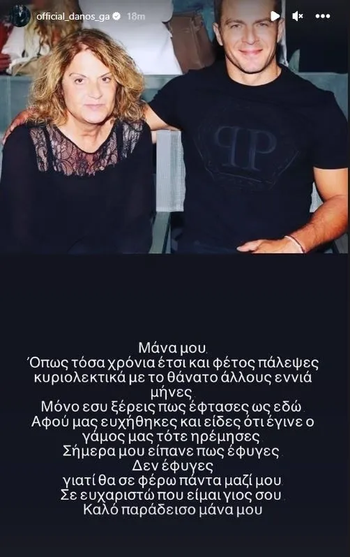 «Μάνα μου. Όπως τόσα χρόνια έτσι και φέτος πάλεψες κυριολεκτικά με το θάνατο άλλους εννιά μήνες. Μόνο εσύ ξέρεις πως έφτασες ως εδώ. Αφού μας ευχήθηκες και είδες ότι έγινε ο γάμος μας τότε ηρέμησες. Σήμερα μου είπανε πως έφυγες. Δεν έφυγες γιατί θα σε φέρω πάντα μαζί μου. Σε ευχαριστώ που είμαι γιος σου. Καλό παράδεισο μάνα μου», έγραψε χαρακτηριστικά σε instastory του.