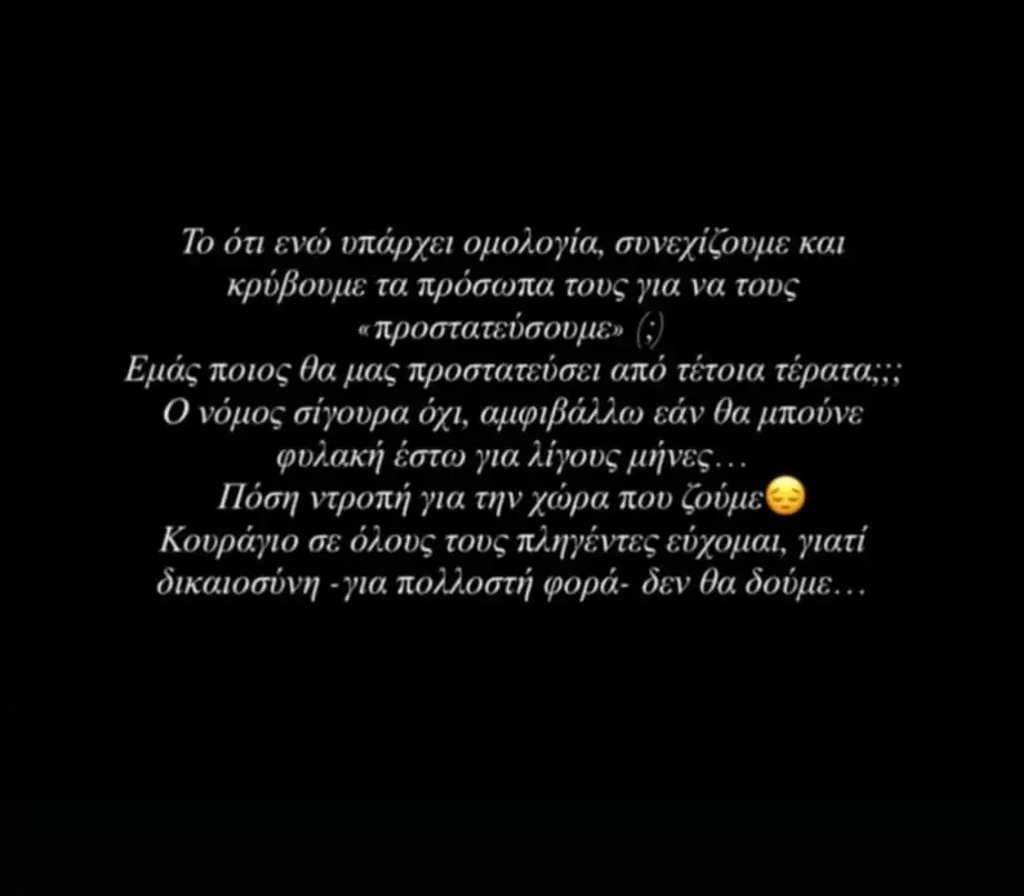 «Το ότι ενώ υπάρχει ομολογία συνεχίζουμε και κρύβουμε τα πρόσωπα τους για να τους “προστατεύσουμε” (;). Εμάς ποιος θα μας προστατεύει από τέτοια τέρατα;