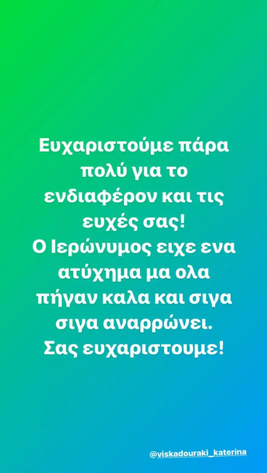 Επιπλέον, ευχαρίστησε τους διαδικτυακούς του φίλους για τις ευχές που του έστειλαν. Συγκεκριμένα, έγραψε: «Ευχαριστούμε πάρα πολύ για το ενδιαφέρον και τις ευχές σας! Ο Ιερώνυμος είχε ένα ατύχημα μα όλα πήγαν καλά και σιγά σιγά αναρρώνει. Σας ευχαριστούμε!».