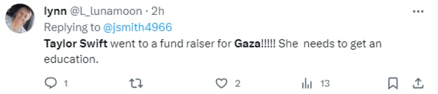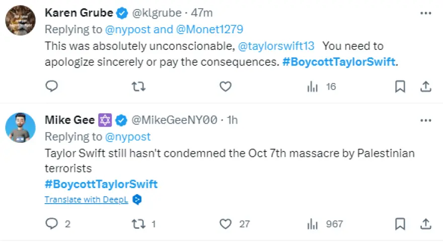 Ωστόσο, «πυρά» δέχτηκε και η Τέιλορ Σουίφτ, με πολλούς να της εναντιώνονται στα social media, κατηγορώντας την πως υποστηρίζει «τη λάθος πλευρά» και «συμβάλλει στη δαιμονοποίηση του Ισραήλ».