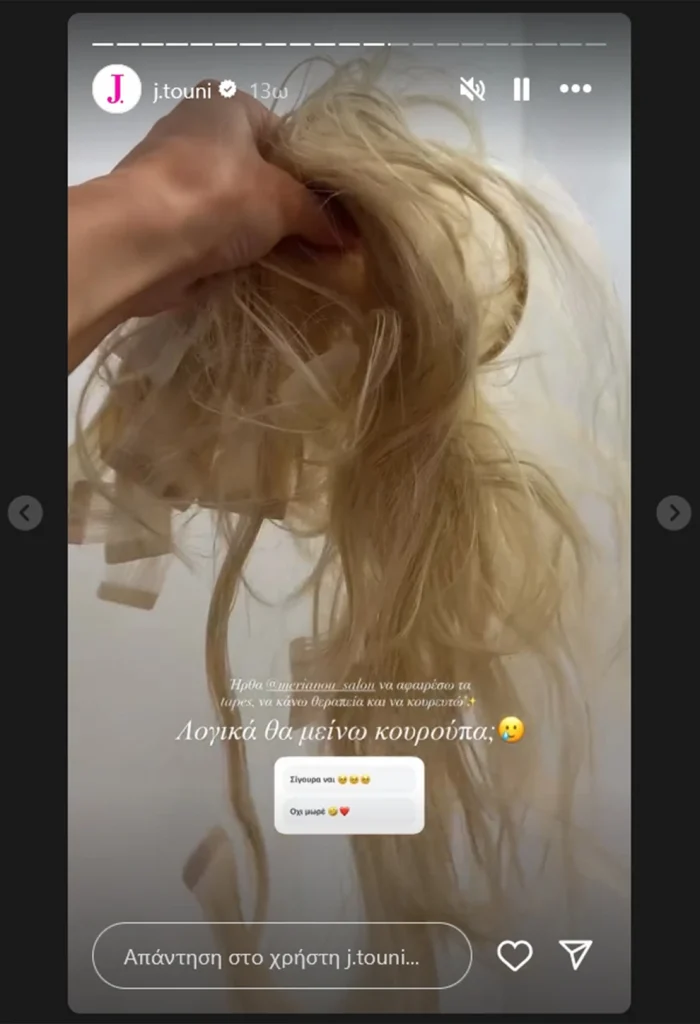 «Λογικά θα μείνω κουρούπα», έγραψε, δείχνοντας τα μαλλιά που αποχωρίστηκε. «Νιώθω φαλακρή, για να δούμε τι θα δούμε», πρόσθεσε.