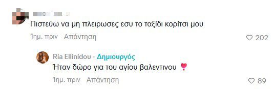 «Το ταξίδι ήταν δώρο του Αγίου Βαλεντίνου» παραδέχτηκε η Ρία Ελληνίδου σε ερώτηση που της έκανε δική της follower και κάποια εκεί μακριά στην συμπρωτεύουσα, μας είπαν ότι δέχτηκε μαχαίρι στην καρδιά με την απάντησή της.