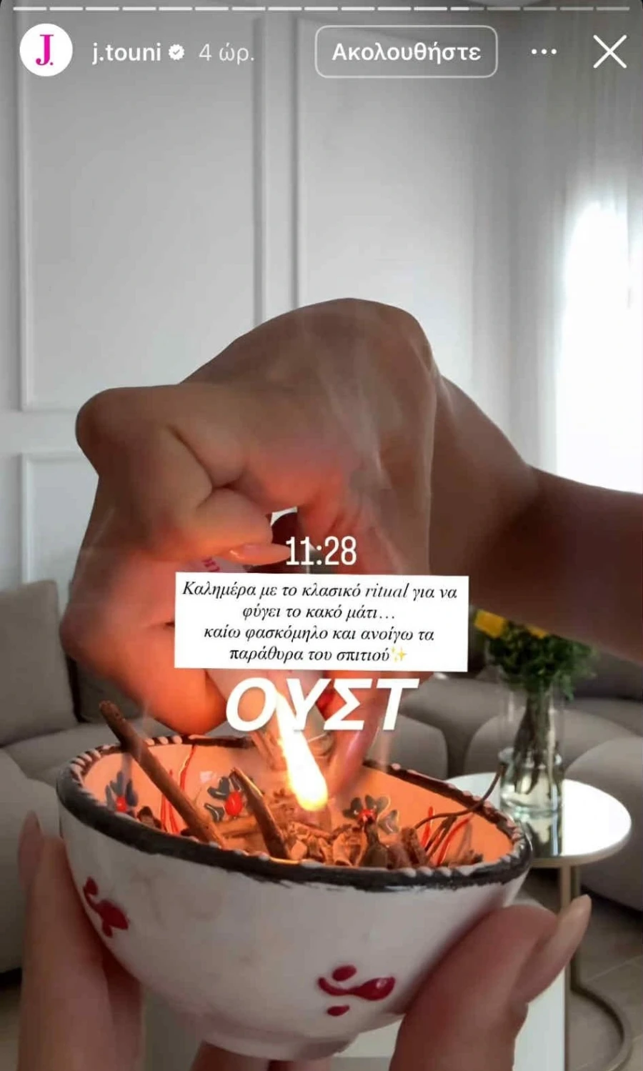Σε πρόσφατο βίντεο που δημοσίευσε στον προσωπικό της λογαριασμό στο Instagram, η Ιωάννα Τούνη μοιράστηκε με τους ακολούθους της μια πτυχή από την πρωινή της ρουτίνα, η οποία έχει περισσότερο συμβολικό και ενεργειακό χαρακτήρα.