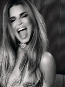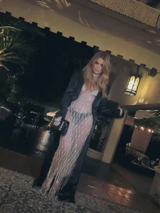 Στις φωτογραφίες που ανέβασε στα social media, ποζάρει με το ιδιαίτερο φόρεμα, το οποίο συνδύασε με μαύρο εσώρουχο, ψηλοτάκουνα πέδιλα και ένα λαμπερό τσόκερ.