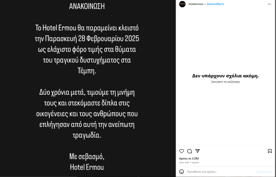 «Το Hotel Ermou θα παραμείνει κλειστό την Παρασκευή 28 Φεβρουαρίου 2025 ως ελάχιστος φόρος τιμής στα θύματα του τραγικού δυστυχήματος στα Τέμπη. Δύο χρόνια μετά, τιμούμε τη μνήμη τους και στεκόμαστε δίπλα στις οικογένειες και τους ανθρώπους που επλήγησαν από αυτή την ανείπωτη τραγωδία».