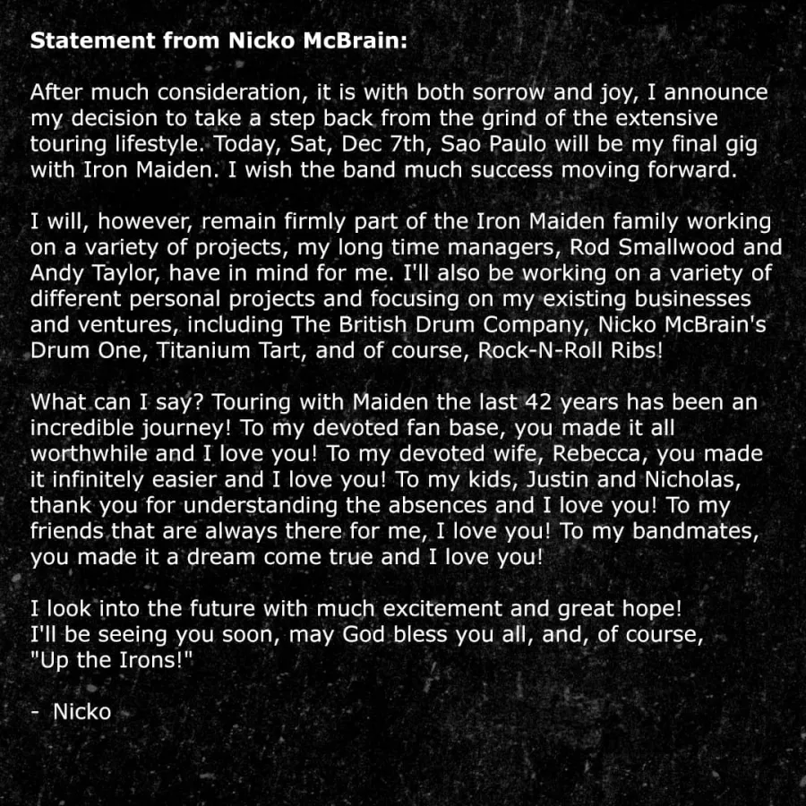 Θα παραμείνω, ωστόσο, σταθερά μέλος της οικογένειας των Iron Maiden δουλεύοντας σε διάφορα projects, που έχουν στο μυαλό τους οι επί χρόνια μάνατζέρ μου, Rod Smallwood και Andy Taylor. Επίσης, θα δουλεύω σε διάφορα προσωπικά projects και θα επικεντρωθώ στις υπάρχουσες επιχειρήσεις και εγχειρήματά μου, συμπεριλαμβανομένων των The British Drum Company, Nicko McBrain’s Drum One, Titanium Tart και φυσικά Rock-N-Roll Ribs!