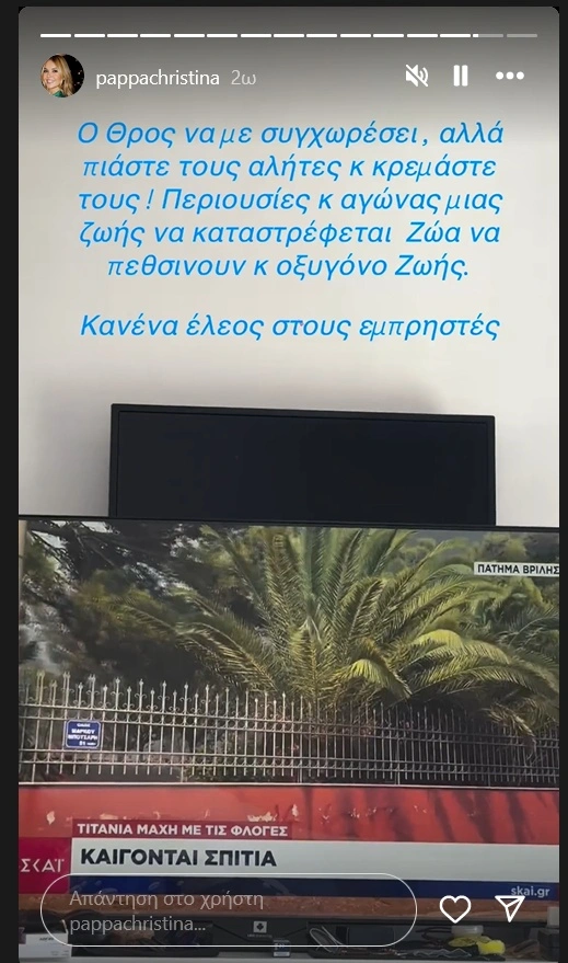 Η Χριστίνα Παππά, το απόγευμα της Δευτέρας (12/8) μέσω ενός story στο Instagram, ξέσπασε για τις φωτιές που έχουν ξεσπάσει τις τελευταίες ώρες στην Αττική.