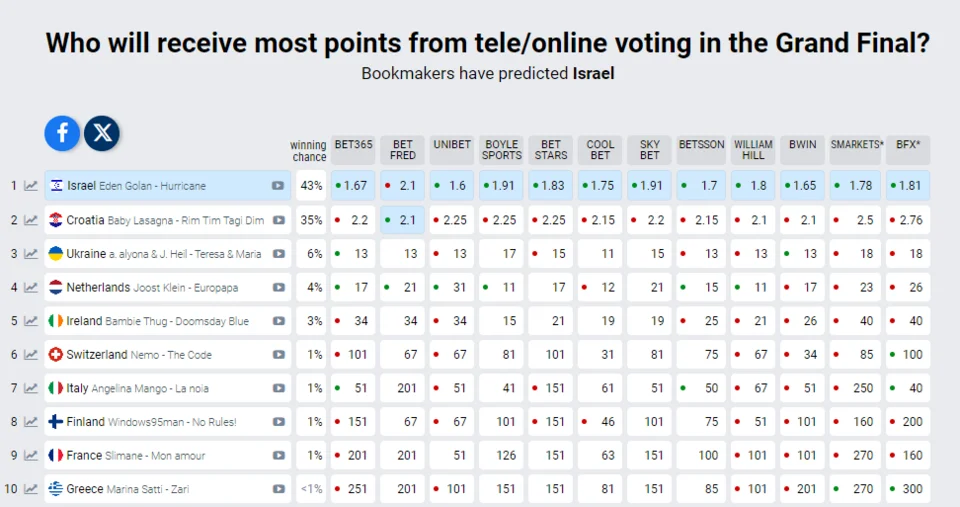 Την ίδια ώρα, τα προγνωστικά έχουν αντιστραφεί πλήρως υπέρ της. Από 8η που ήταν πριν από τον β’ ημιτελικό, βρέθηκε 2η σήμερα το πρωί και το απόγευμα προσπέρασε τον Κροάτη και είναι πλέον φαβορί για τη νίκη και μάλιστα με σημαντική διαφορά!