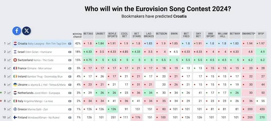 Σύμφωνα με τα τελευταία προγνωστικά η Κροατία παραμένει το μεγάλο φαβορί τον τελικό της Eurovision ενώ το Ισραήλ που έχει προκαλέσει σάλο στον φετινό διαγωνισμό «σκαρφάλωσε» στη δεύτερη θέση.