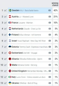Όσον αφορά τη «μάχη» της κορυφής, η Σουηδία με το συγκρότημα KAJ και το «Bara bada bastu» συνεχίζει να είναι το απόλυτο φαβορί της διοργάνωσης.