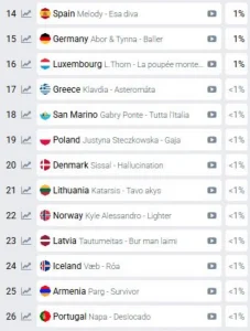 Σχετικά με τις υπόλοιπες θέσεις, το Ισραήλ φαίνεται να υποχωρεί, καθώς πλέον βρίσκεται εκτός πεντάδας, με τις Εσθονία, Ελβετία, Αλβανία και Μάλτα να έχουν τον πρώτο λόγο για είσοδο στη δεκάδα, την ώρα που το Ηνωμένο Βασίλειο, η Ιταλία και η Ουκρανία προσπαθούν να ανέβουν.