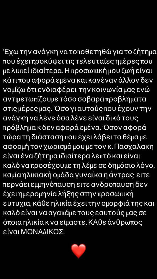 Και επέλεξε να το κάνει μέσα από τον προσωπικό της λογαριασμό στο Instagram, επιβεβαιώνοντας τον χωρισμό της και ξεσπώντας παράλληλα για τα όσα ακούστηκαν σε τηλεοπτική εκπομπή για την ηλικία της.