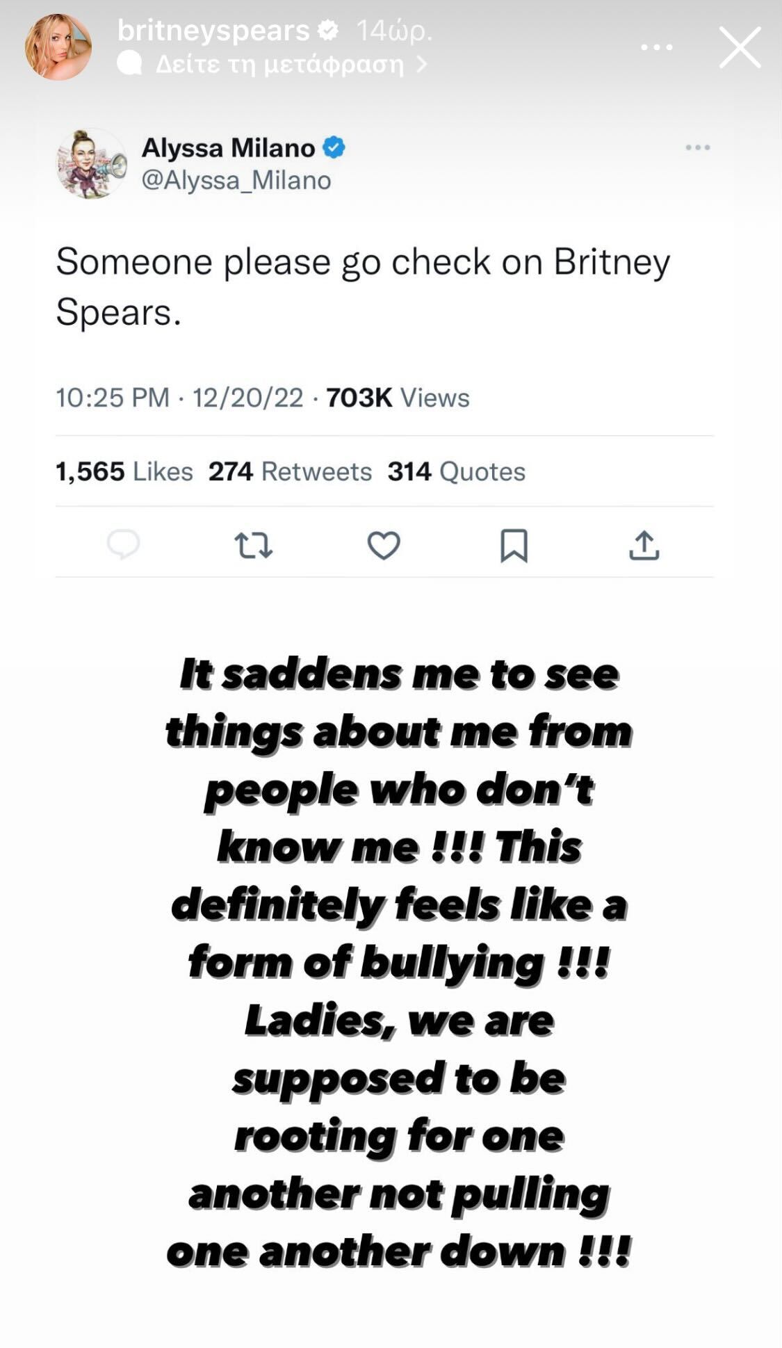 «Με στενοχωρεί να βλέπω πράγματα για εμένα από ανθρώπους που δεν με γνωρίζουν. Αυτό σίγορα μοιάζει με μια μορφή εκφοβισμού», γράφει η Μπρίτνεϊ Σπίαρς, πάνω από ένα screenshot με την ανάρτηση της Αλίσα Μιλάνο.