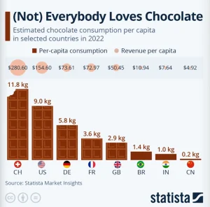 Η Ελβετία βρίσκεται στην πρώτη θέση της λίστας που δημοσίευσε Statista.com σχετικά με τη μέση ποσότητα κατανάλωσης σοκολάτας κατά άτομο για το 2022.