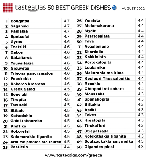 Στην πρώτη θέση του Αυγούστου του 2022 ως το καλύτερο ελληνικό φαγητό είναι η μπουγάτσα, με βαθμολογία 4,7 στα 5 αστέρια, σύμφωνα με το σύστημα βαθμολόγησης του TasteAtlas. Η αγαπημένη σφολιάτα βρίσκεται στην πρώτη θέση των 50 καλύτερων ελληνικών γεύσεων, ανάμεσα σε συνολικά 340 πιάτα που έχουν αναφερθεί στην πλατφόρμα, κυρίως από τουρίστες.
