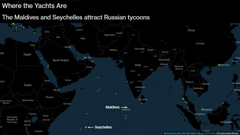 Χάρτης του Bloomberg με τα σούπερ γιοτ των Ρώσων δισεκατομμυριούχων σε Μαλδίβες και Σεϋχέλλες