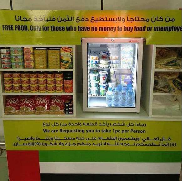 Εδώ δίνουν δωρεάν φαγητό, όπως αναφέρει και επάνω το μηχάνημα, σε όσους δεν έχουν χρήματα ή είναι άνεργοι. Έλα όμως που είναι μονίμως γεμάτο με πράγματα, μιας και δεν υπάρχουν άνθρωποι σε αυτές τις δύο κατηγορίες!