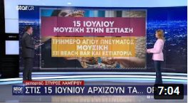 Σύμφωνα με το ρεπορτάζ του STAR οι χώροι της εστίασης θα λειτουργήσουν και πάλι με μουσική στις 15 Ιουλίου στους εξωτερικούς χώρου, όσον αφορά τα beach bar η μουσική φαίνεται πως θα ξεκινήσει πριν από το τριήμερο του Αγίου Πνεύματος, δηλαδή πριν τις 15 Ιουνίου!
