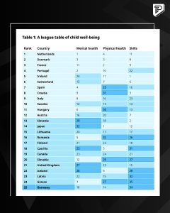 Η Ιαπωνία σημειώνει την κορυφαία επίδοση στον τομέα της σωματικής υγείας, ωστόσο υστερεί σημαντικά στην ψυχική υγεία των παιδιών. Από την άλλη, η Ιρλανδία διακρίνεται στον τομέα της εκπαίδευσης, αλλά αντιμετωπίζει δυσκολίες όσον αφορά την ψυχική και συναισθηματική ευημερία των νέων.