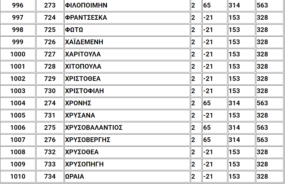 Ολοκληρωμένος ο πίνακας βρίσκεται στο https://www.foundalis.com/grk/EllinikaOnomata.html και θα σου δείξει τη θέση που βρίσκεται το δικό σου όνομα.