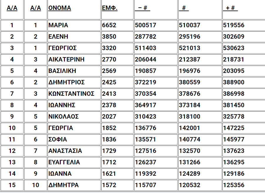 Σύμφωνα με τον πίνακα της έρευνας λοιπόν, τα πιο συνηθισμένα ελληνικά ονόματα είναι