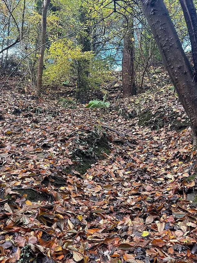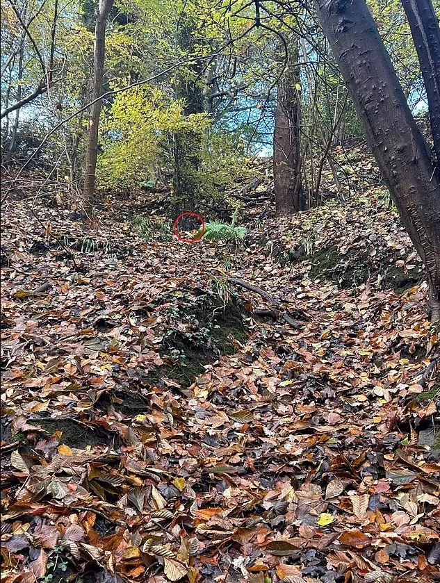 Η φωτογραφία δείχνει τον σκύλο του να κρύβεται σε έναν επικλινή λόφο με πυκνά δέντρα και ένα χαλί από καστανοκόκκινα, κίτρινα και καφέ φύλλα στο έδαφος.