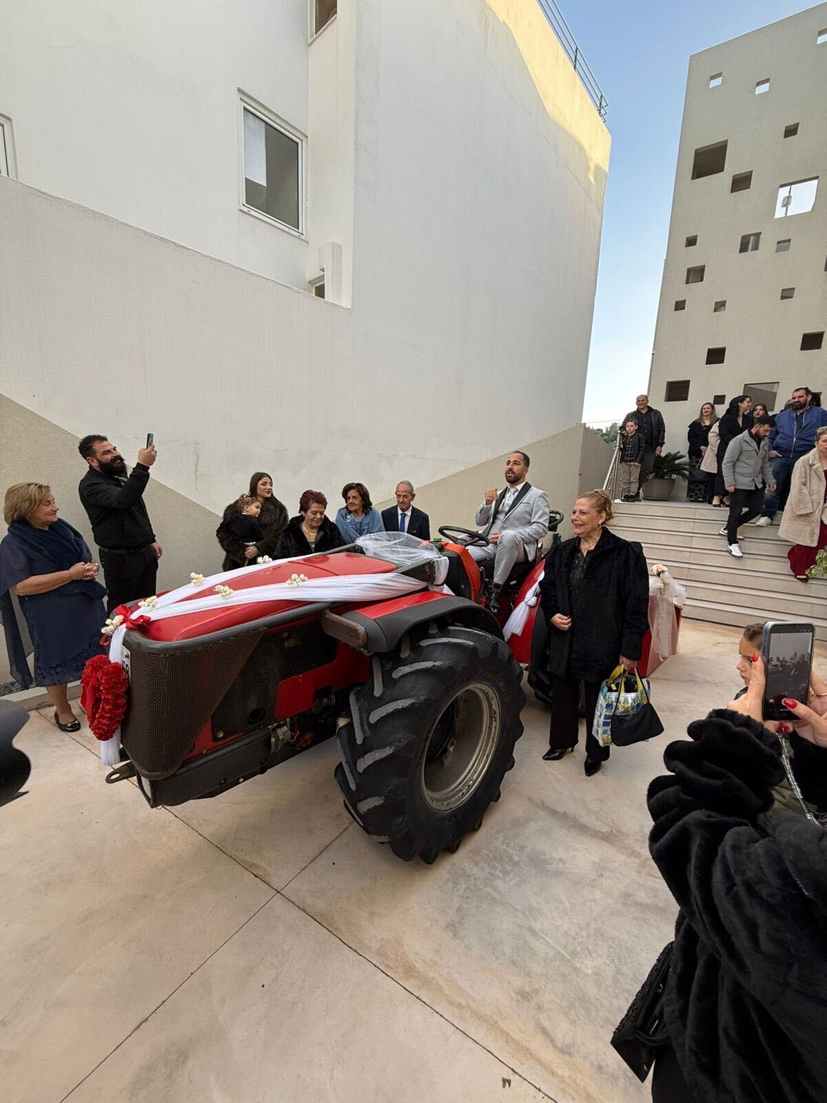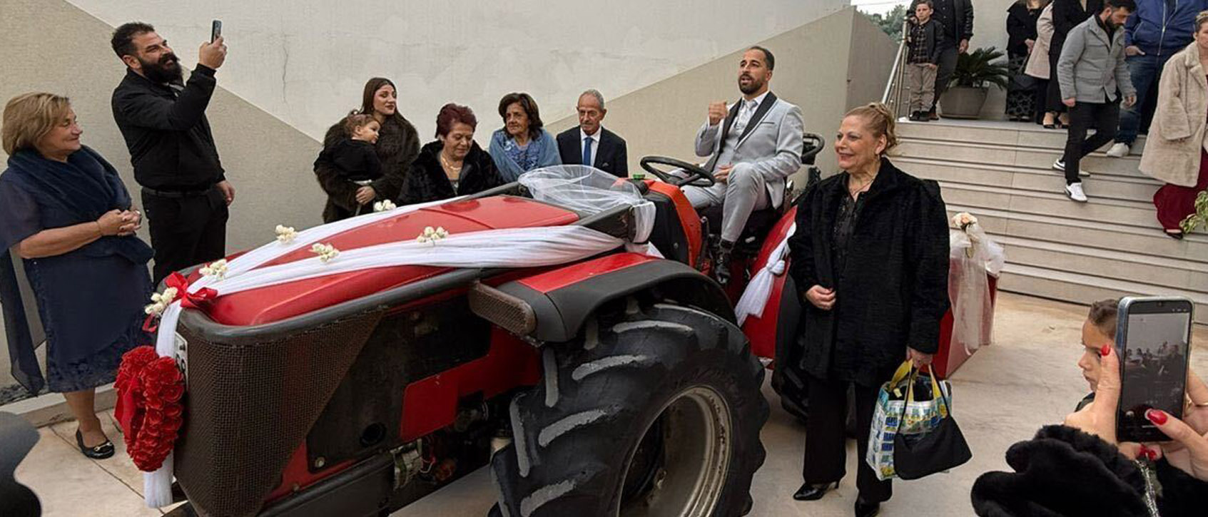 Ο Χρήστος Λυδής έφτασε στην εκκλησία οδηγώντας ο ίδιος ένα… τρακτέρ, καθώς εκτός από ικανός επιχειρηματίας είναι και ένας από τους πιο σημαντικούς παραγωγούς του νησιού.
