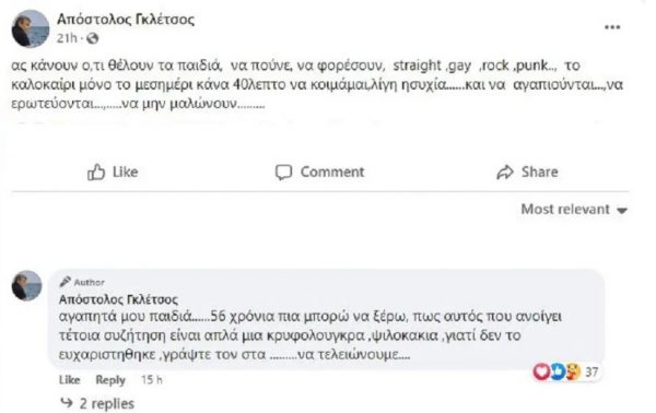 «Ας κάνουν ό,τι θέλουν τα παιδιά, να πούνε, να φορέσουν, straight, gay, rock, punk, το καλοκαίρι μόνο το μεσημέρι κάνα 40λεπτο να κοιμάμαι, λίγη ησυχία και να αγαπιούνται, να ερωτεύονται, να μην μαλώνουν», έγραψε σε ανάρτησή του.