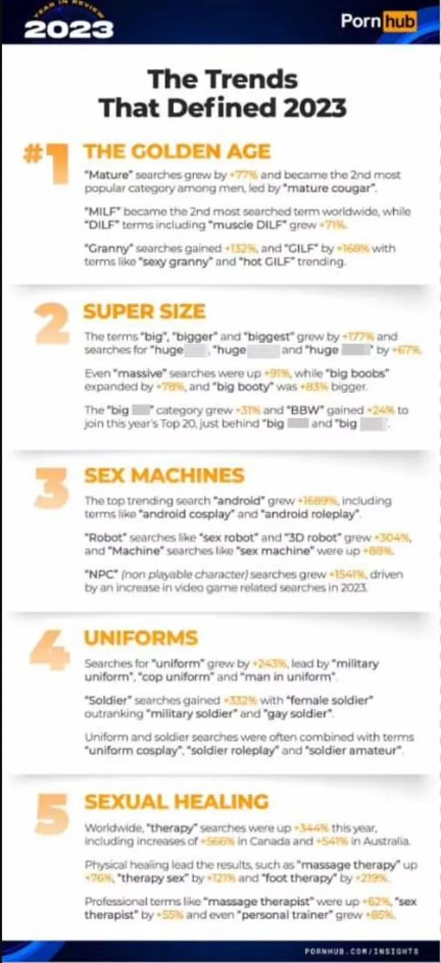 Σύμφωνα με την Daily Mail, οι χρήστες έδειξαν ιδιαίτερο ενδιαφέρον φέτος για το «ώριμο» περιεχόμενο, με αναζητήσεις όπως «σέξι γιαγιά», «MILF», «DILF» και «cougar» να βρίσκονται στις κορυφαίες θέσεις.