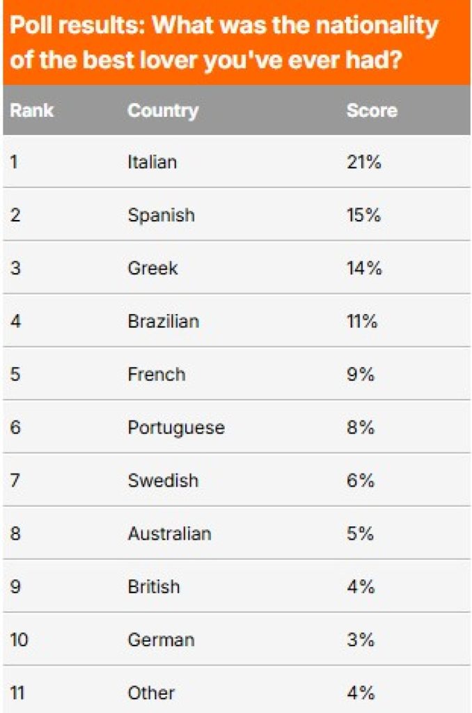 Σύμφωνα με την Daily Mail, η έρευνα, που διενεργήθηκε σε δείγμα 2.000 ατόμων από την εφαρμογή γνωριμιών Wisp, ζήτησε από τους συμμετέχοντες να αποκαλύψουν από πού κατάγεται ο καλύτερος εραστής που είχαν ποτέ.